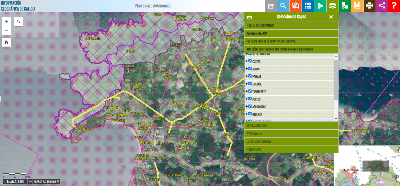 Los organismos autonómicos permiten consultar las afecciones sectoriales. Por ejemplo, el visor de la Xunta de Galicia permite detectar cuáles son las parcelas que se ven afectadas por las áreas de protección de patrimonio, de la zona de afección de costas, de cuencas hidrográficas…