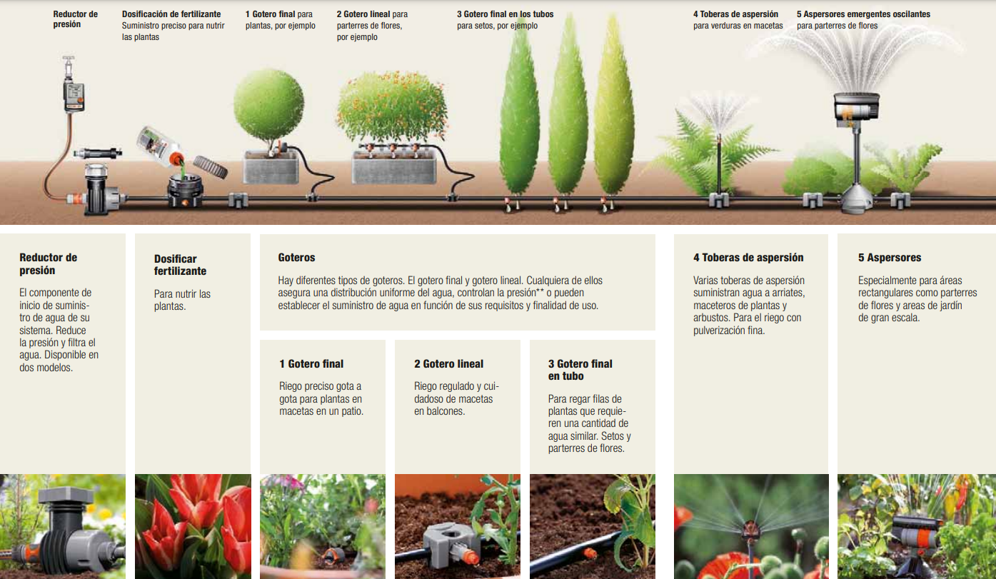 Los otros dos sistemas posibles de riego, en términos generales, son la aspersión con un 80% de eficiencia y la microaspersión, con un 90% de efectividad. A la hora de poner estos sistemas y los ya mencionados en marcha podemos acudir a un equipamiento complementario que nos ayudará a ajustar la eficiencia y el ahorro de energía y de agua.