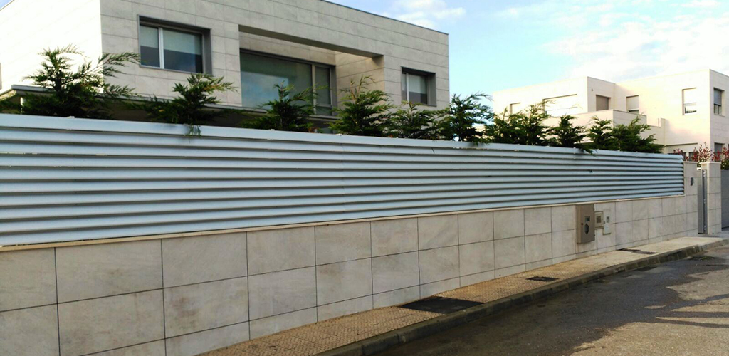 Las parcelas de las urbanizaciones tienen una normativa estricta que les da una uniformidad al conjunto, a pesar de que cada vecino puede personalizar su cerramiento. Lo más habitual es encontrarnos con una norma que nos exige alcanzar una altura máxima opaca de unos 60-80 cm, que debemos de dejar cubierta con un material perfectamente acabado, y una parte superior que puede estar tapada por elementos vegetales o por lamas, de tal manera que no se oculte más del 50% de lo que pasa por detrás.